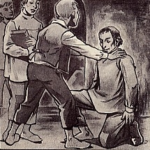 s'agenouille devant le tombeau du saint, le suppliant
